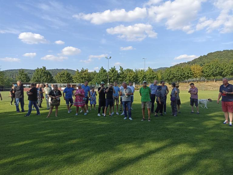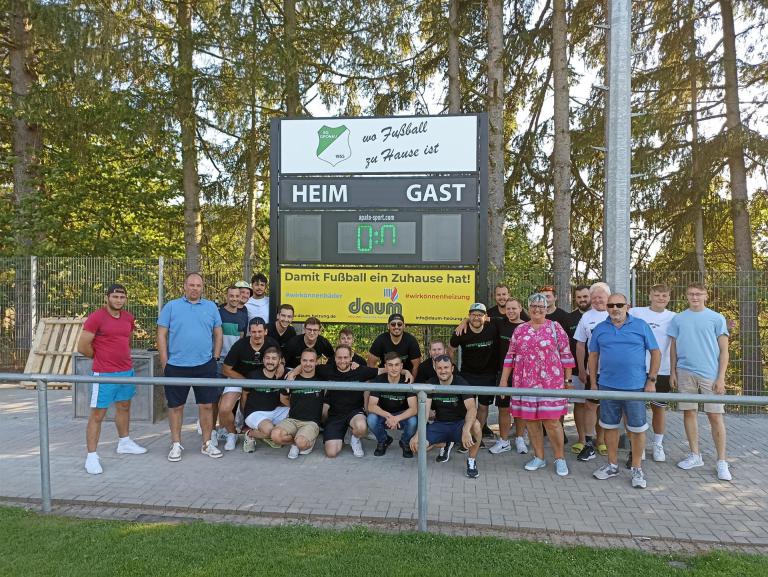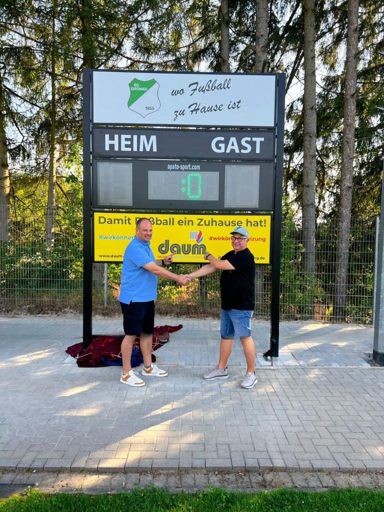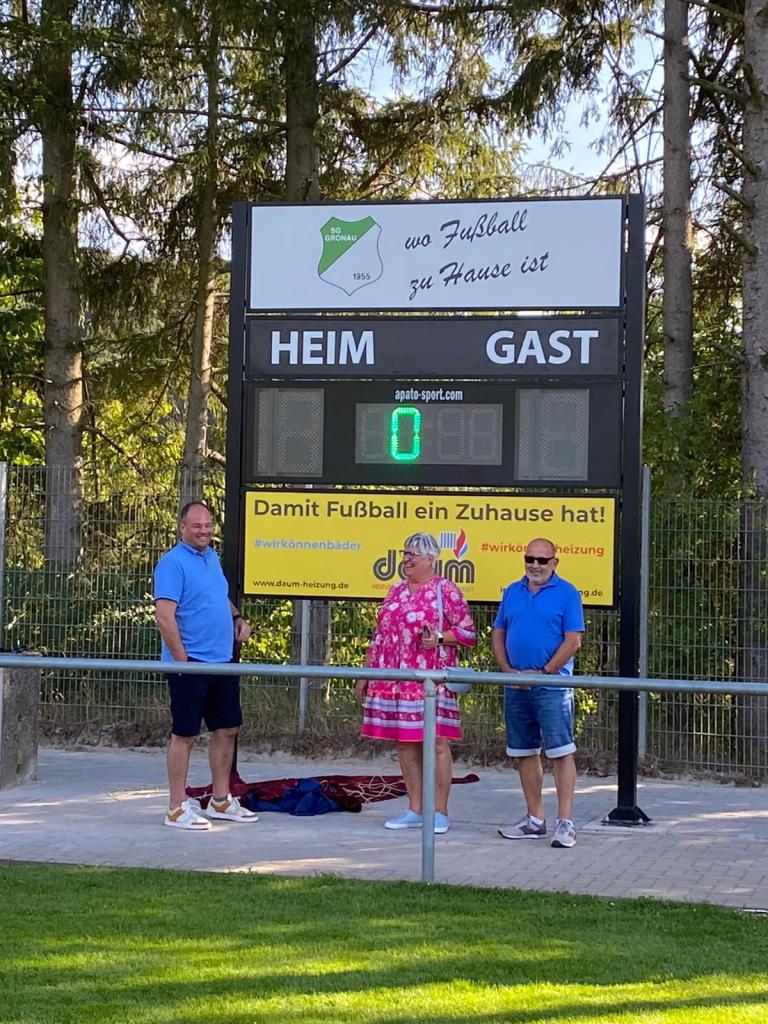 Nach dem offiziellen Teil bat Norbert Rödel alle Gäste sich nochmal sich auf dem Rasenplatz der SG Gronau zu treffen. Hier folgte nun der absolute Höhepunkt des Tages. Dank der Fa. Daum aus Bensheim und hier der besondere Dank an Andreas Ott, Marion und Hans Peter Ott wurde die neue Anzeigetafel feierlich eingeweiht. Beim ersten Heimspiel am Samstag den 23.07.2022 gegen den FV Hofheim wird die Anzeigetafel erstmals in Gebrauch genommen.